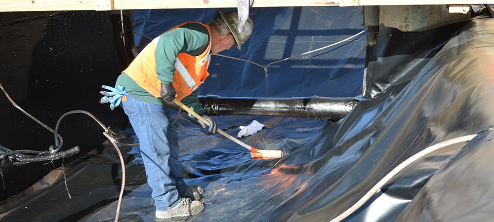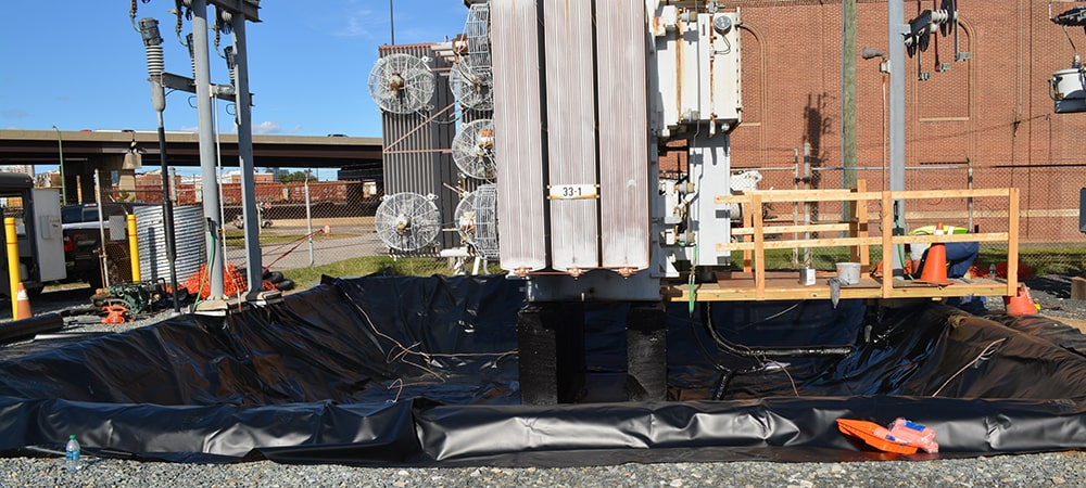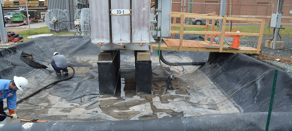 The installation began by power washing the transformer pad and existing HDPE to create a clean surface. Once completed, installers vacuumed out the remaining liquid. DES applied the PolySeam liner to seal the transformer pad first. They supplemented the area around the base of the pad with geotextile fabric and sprayed accordingly.