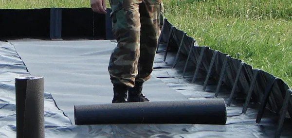 Tire mats and ground tarps protect the berm from puncture and wear from objects lodged in tires or on the ground, respectively.