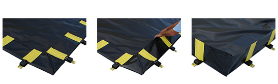 Spill berm is easily transported when folded and comes with carrying handles on all footprints 12' x 26' and larger